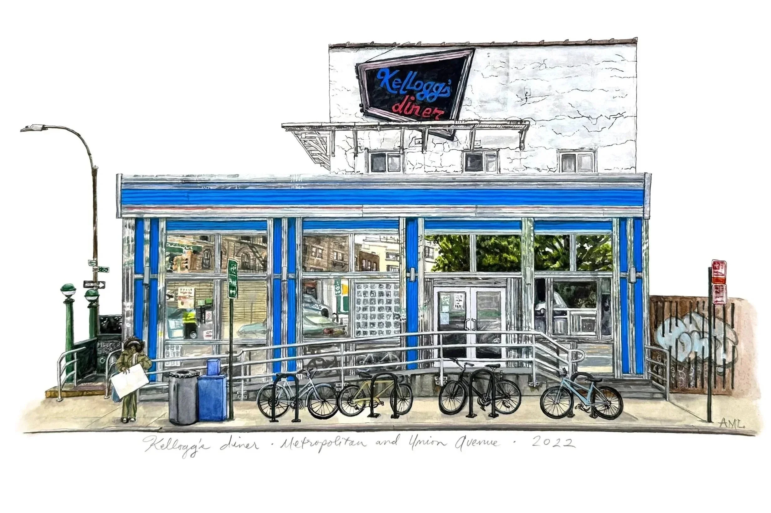 Kelloggs is a classic diner in the heart of Williamsburg, Brooklyn since 1928. The new owner hired me to create unique art for a vintage-style paper placemat and type design for hand painted signage. I also painted a portrait of the diner as it looked pre-2024 renovation.